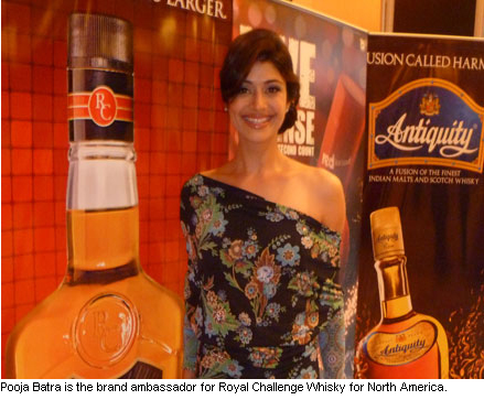 Indian model, actress and entrepreneur Pooja Batra is the U.S. brand ambassador for Royal Challenge Whisky. Batra, a former Miss India, has acted in several Bollywood and Hollywood films and now runs a multimedia production company called Glowbell Inc.